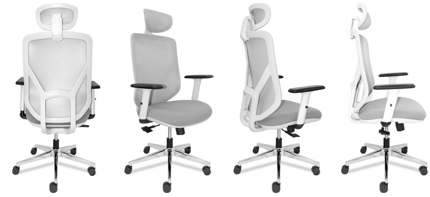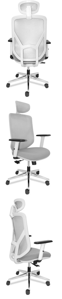 Silla Ergonomica con carcasas blancas, tapizado gris, espaldar en malla traslucida,